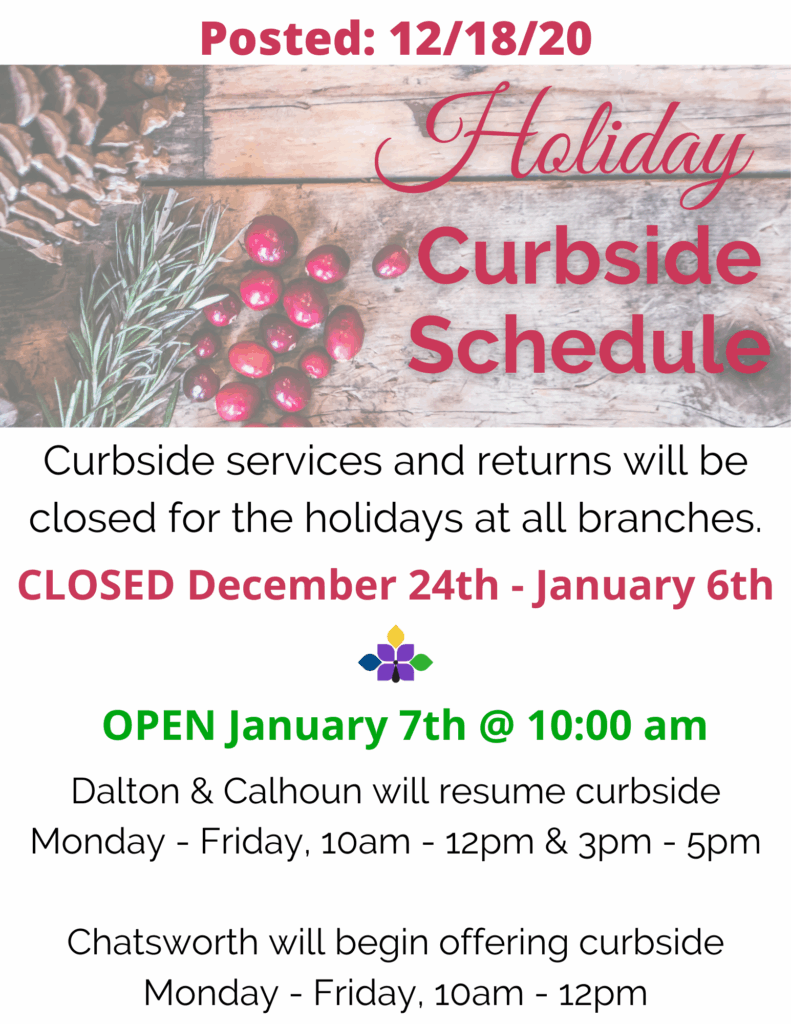 Please note: book returns will not be available during this temporary closure. We will re-open the book drops on January 7th. Items checked from the Northwest Georgia Library System will not have overdue fines charged during this time.